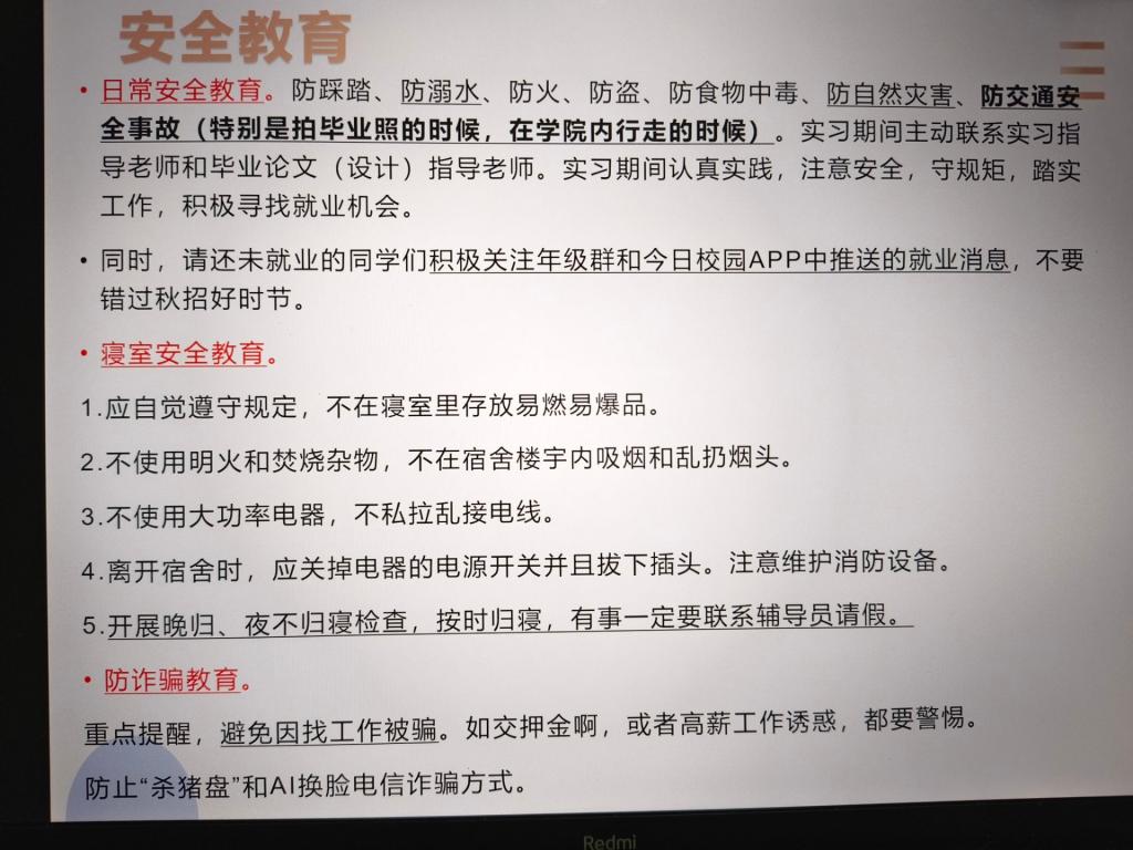 班会中,辅导员结合重庆市教委及学校清明假期安全教育要求,从学生的人身安全、财产安全、交通安全、饮食安全、宿舍安全等多个方面向同学们讲解,强调了假期安全教育的重要性以及需要注意的事项。最后,辅导员们结合各类安全教育视频,多角度向同学们展示了身边存在的安全隐患,再次强调同学们要养成良好的生活行为习惯,严格遵守学校各项规章制度,加强安全意识。