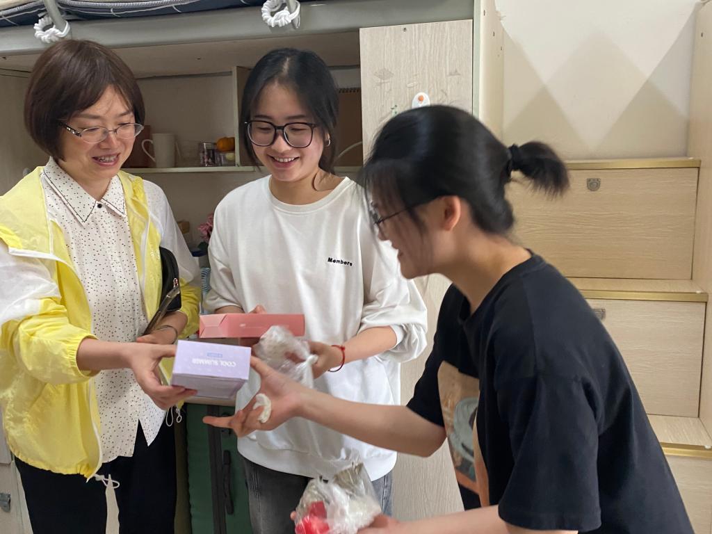 代远红首先向联系的桂花苑2舍601寝室的同学们送上了解暑风扇、粽子等慰问品,随后在聆听四名同学的暑期实习安排时,她强调实习是大学生毕业走向社会前锻炼心性积累经验的重要方式,鼓励同学们发扬我校学子谦卑刻苦的传统,在各自的实习岗位上努力好问、持续学习。提到端午节,代远红向同学们分享了端午节的来源和习俗,希望同学们增强民族文化认同感,将民族文化自信内化于心、外化于形。