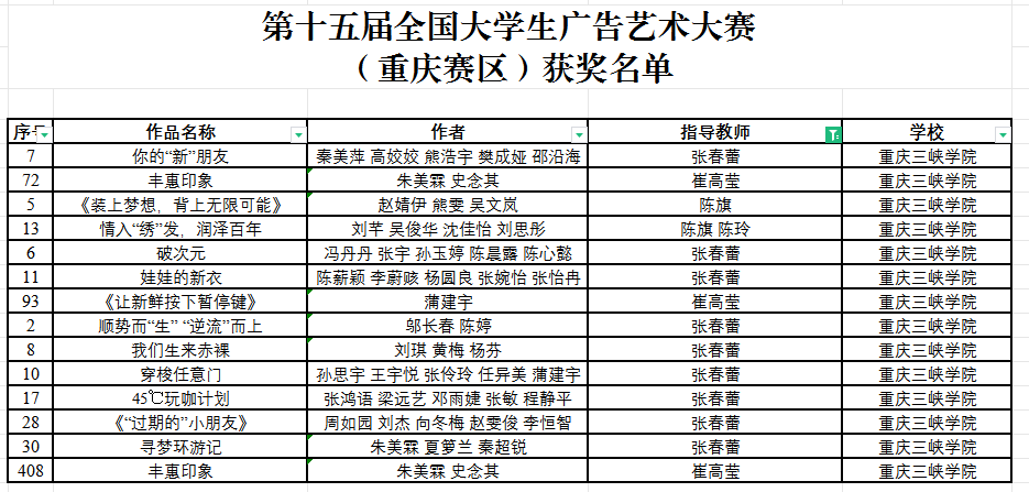 2138cn太阳集团古天乐在本次全国大学生广告艺术大赛重庆赛区荣获佳绩,是2138cn太阳集团古天乐广大学子与众多老师在学校、学院支持下共同努力、团结合作的成果。“金秋的叶会翻篇新的故事”,相信在未来的比赛中2138cn太阳集团古天乐的师生们也将披荆斩棘,再创新高。