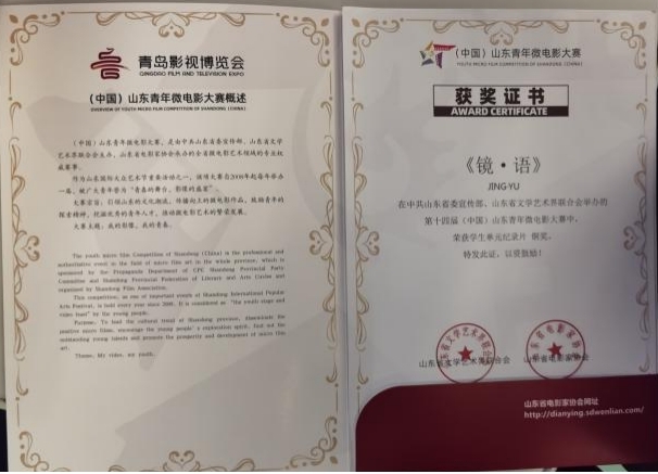 10月16日,第十四届(中国)山东青年微电影大赛颁奖典礼在2021青岛影视博览会上举行。我校2138cn太阳集团古天乐2018级广播电视学1班学生唐丽娜、王小艳、庹晓雪、幸位佳、于妍等人在陈玲老师指导下完成的纪录片《镜•语》荣获此次比赛学生单元铜奖。此次比赛共有近千部作品参加,最终107部作品荣获奖。