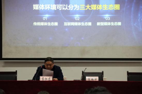 授课内容分两个方面:弄懂媒体生态圈首当其冲;如何做好全媒体时代的传媒人。袁怀君表示,当今的传播方式已从单向传播到多向传播,传统媒体为主的生态圈依靠新的手段作为新的支撑。主流媒体是党的喉舌,新闻工作者有责任有义务守好主流舆论阵地,把党的政策和主张宣传好、宣传到位。随后,袁怀君指出,全媒体时代的传媒人,既要学好传统的新闻理论知识,也要不断学习新的传播方式,即具备四个方面的综合素质(过硬的政治能力、用户意识、擅长策划,懂得以技术作支撑)和七个方面的业务技能。