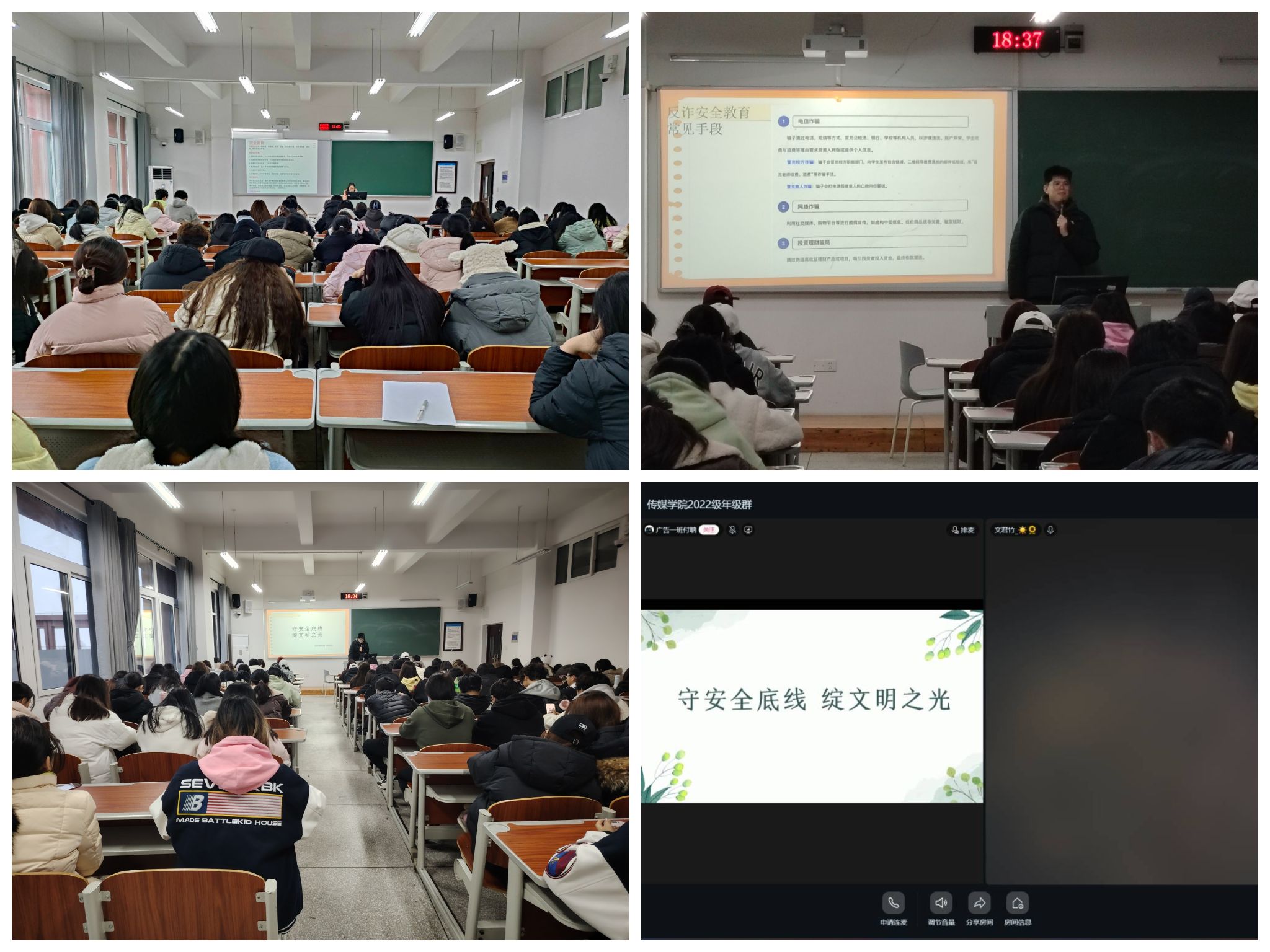 3月9日,2138cn太阳集团古天乐各年级辅导员分批次组织开展了“守安全底线 绽文明之光”主题班会活动。本次班会围绕人身安全、消防安全、财产安全、交通安全四大方面展开系统教育,并融合文明礼仪规范培养,为构建平安文明校园筑牢根基。