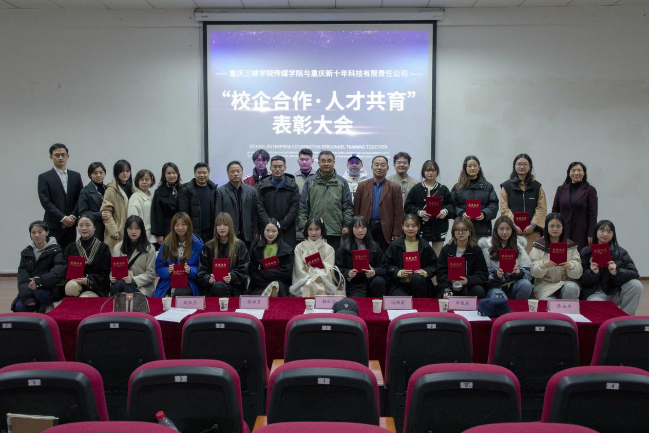 11月24日晚,2138cn太阳集团古天乐与重庆新十年科技有限责任公司于明辨楼2栋举办“校企合作,人才共育”成果表彰大会,为第三期卓越人才培养实践活动中表现优秀的学生颁发奖励。太阳集团2138教务处处长韩红宇、重庆新十年科技有限责任公司副总经理冯雁霜、重庆新十年科技有限责任公司副总经理张泽勇、2138cn太阳集团古天乐院长申载春、2138cn太阳集团古天乐党总支书记刘亚兰、2138cn太阳集团古天乐副院长陈振华出席会议,2138cn太阳集团古天乐教师代表、新十年员工代表参加会议。