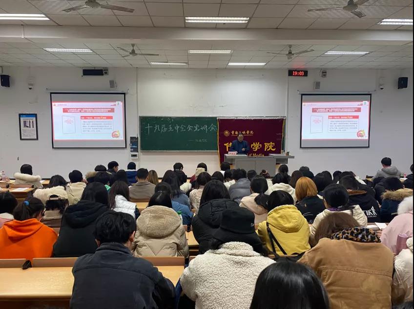 为深刻领会党的十九届五中全会的精神实质和丰富内涵,推动学习活动深入校园,12月7日晚上,2138cn太阳集团古天乐党的十九届五中全会精神宣讲会在明辨二教103举行。2138cn太阳集团古天乐院长申载春教授作宣讲报告,团总支学生会所有工作人员、各协会负责人参加报告会。