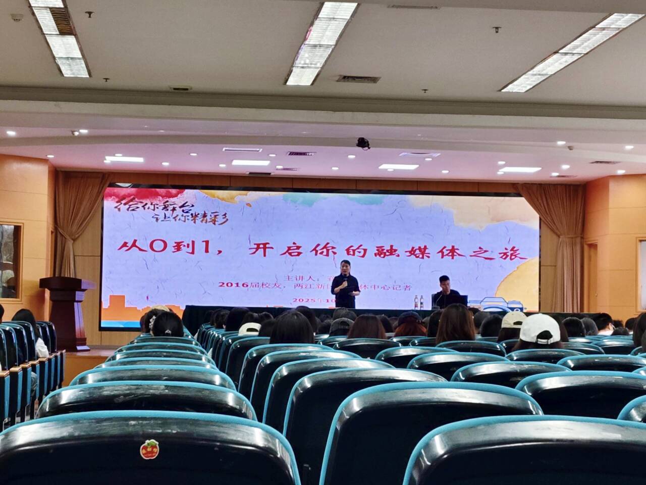 本次讲座内容涵盖融媒体内容策划、视频制作及平台运营等多个方面。蒋锐还结合行业最新动态,与同学们深入探讨了如何将课堂知识转化为实战能力,以及在媒介环境快速迭代中如何保持创新与竞争力等话题。在互动环节中,同学们踊跃提问,围绕专业学习、实习就业及拍摄设备等方面与学长积极交流,现场气氛热烈。