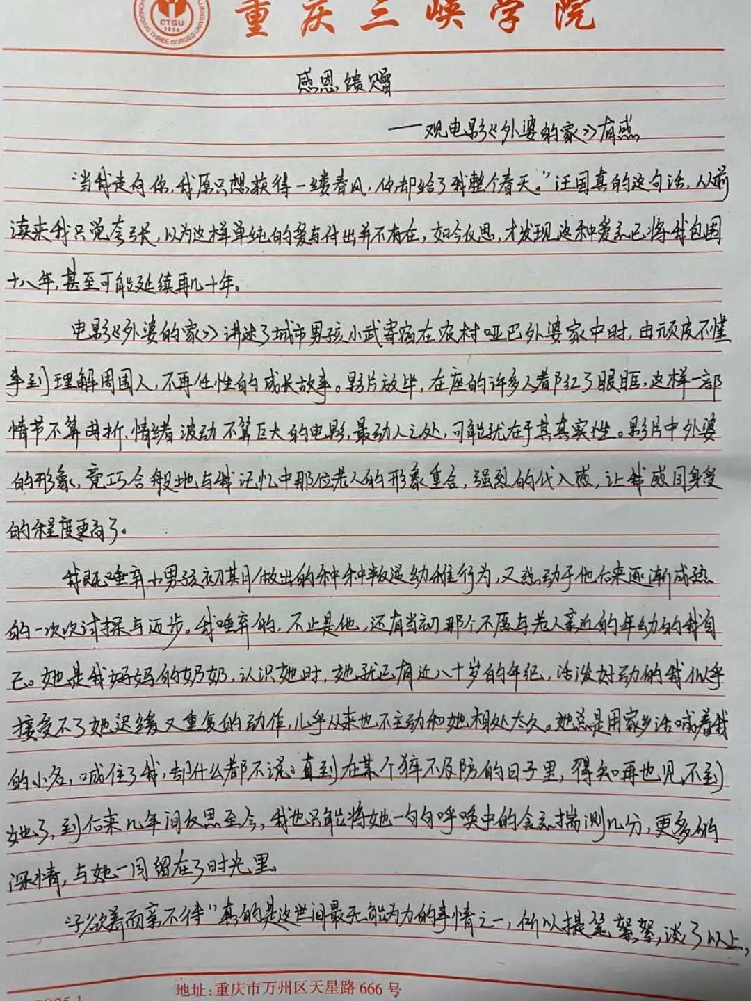 该电影讲述的是7岁的相宇被母亲暂时托付给他的外婆。外婆年事已高,不能说话也不识字,一直生活在城市里相宇,刚开始无法适应乡下生活。他开始流露出不满,不停抱怨。外婆默默包容着孙子的一切,渐渐的,相宇也体会到外婆的良苦用心,适应并喜欢上了乡下生活的故事。活动后同学们写下了电影观后感和给家人的一封信。同学们积极参与,用心写下。每一笔、每一个字都寄托了自己内心深厚的情感,在每一篇观后感中,同学们都表达了自己对家人、对亲情的理解:每一封信中,同学们都表达了自己对的家人的感恩和想念。