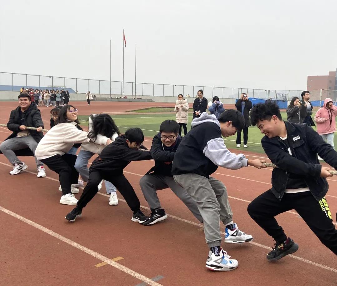 在拔河比赛开始前,班长张海涛带领班级队伍做好热身运动。慢跑一圈后,紧张刺激的拔河比赛拉开帷幕。比赛中,男女生脱去了厚重的棉袄,轻装上阵,形成了两支队伍。两边的选手齐心协力,热情高涨,咬紧牙关拉动绳索,在一片欢声笑语中完成了两轮比拼。