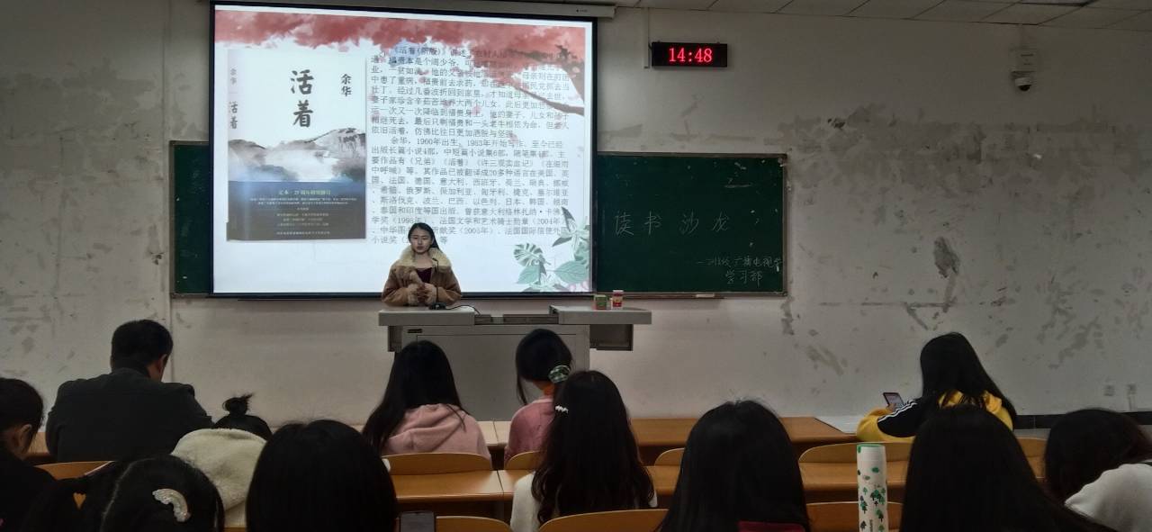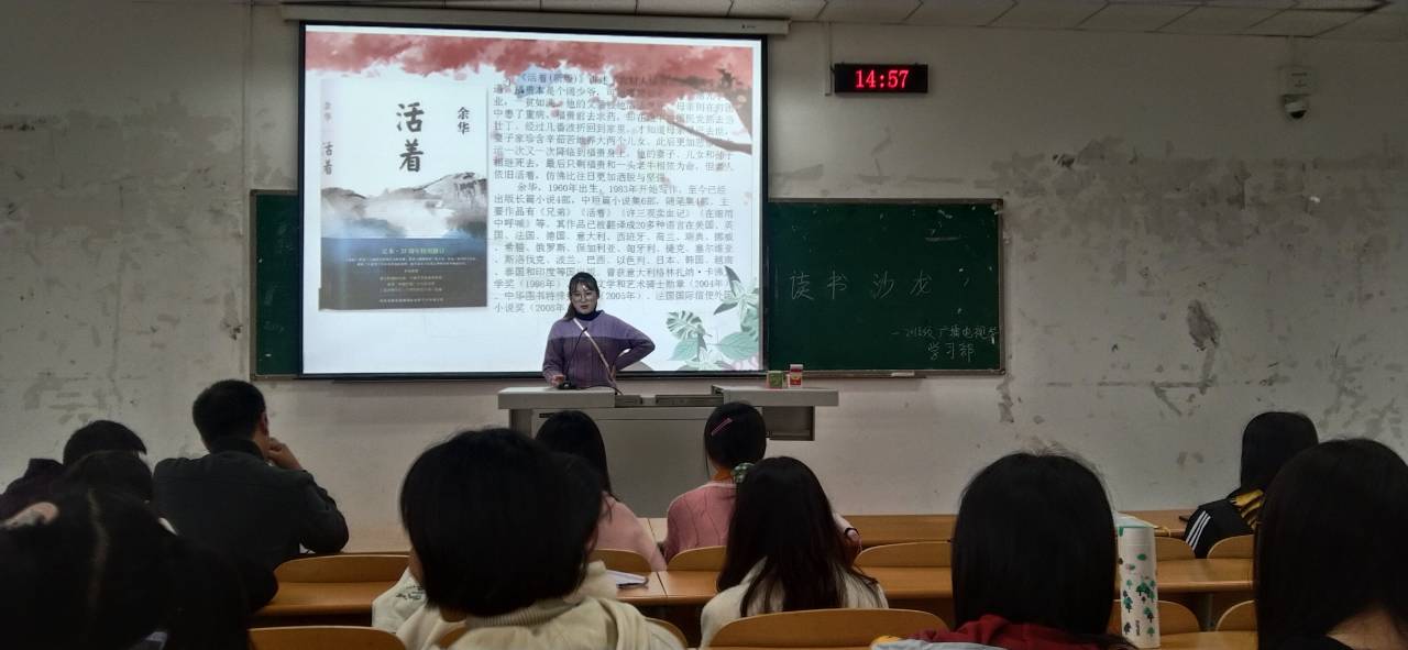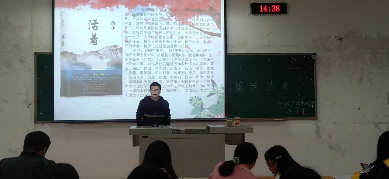 在读书沙龙读书交流会举办过程中,在学习部作了开场之后,18 级广播电视学1班和2班学委对本次要分享的书做了简单的概述。18 级广播电视学 1 班和广播电视学2班的同学们就《活着》这本小说展开了精彩而热烈的发言。这本书采用第一人称,让人感到真切,有代入感。其中让我们深有同感的有:幸福的人是相似的,不幸的人各有各的不幸。我们对灾难无法预料,但也无需纠结。是啊!活着这本书引发了我们对生命和生存的思考,活着其实比死亡更可怕,如果一人无追求,希望,那他只是行尸走肉,只是生存并不是生活,但现在这个世界仍有连生存都满足不了的人,怎么来生活。所以我们应努力改变,努力明白自己活着的意义。不需要多么明亮耀眼,只需自己沉淀散发馨香。有很多借口让你放弃生命,但有很多希望让我们继续享受生活。