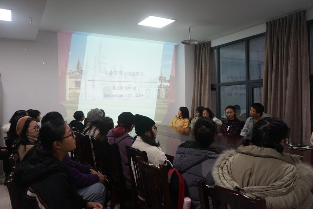在语言学习方面,鲁忠欣校友提出了几点建议:口语方面,要进行模仿和跟读,练习口语的同时还能了解新闻,有利于专业的学习;听力方面,最重要的是听懂。一种方法是快速朗读,一种方法是进行句子的复述练习,由一句到两句三句递加,听后复述句子内容;写作方面,要注重议论文写作。