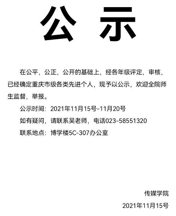 2021年11月15日,我院初评选出本科学生先进并进行公示。开展学生先进评选活动是贯彻落实立德树人根本任务,进一步加强和改进大学生思想政治教育工作的一项重要举措,我学院高度重视,坚持标准,严格审核,公开、公平、公正地开展推荐工作,坚决杜绝评优工作中的不正之风。