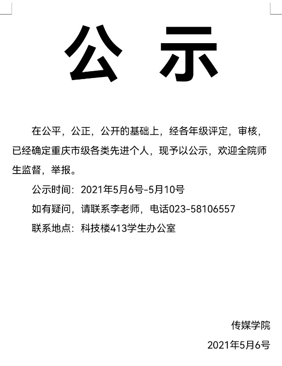 2021年5月6日,我院初评选出本科学生先进并进行公示。开展学生先进评选活动是贯彻落实立德树人根本任务,进一步加强和改进大学生思想政治教育工作的一项重要举措,我学院高度重视,坚持标准,严格审核,公开、公平、公正地开展推荐工作,坚决杜绝评优工作中的不正之风。